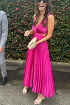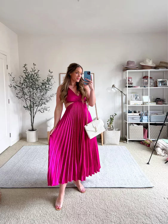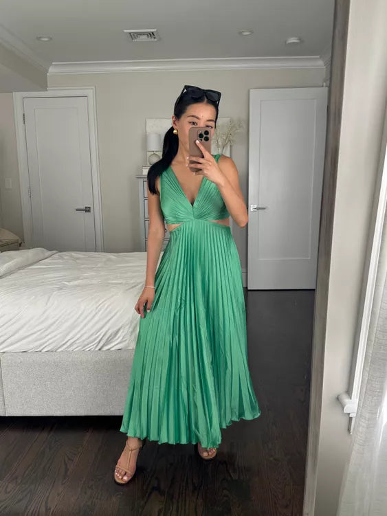 Women's Deep V-Neckline Pleated Maxi Dress with Twist Front and Side Cut-Outs