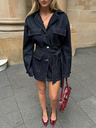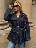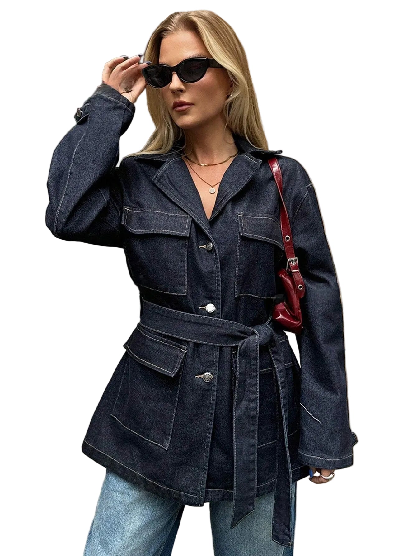 Women's Denim Jacket with Belt and Lapel Collar and Chest Flap Pockets