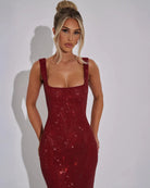 This maxi dress for women features a square neckline and wide shoulder straps. The surface displays an embellished texture with scattered reflective details across the full-length hemline. The back includes a scoop cut that extends below the shoulder blades.