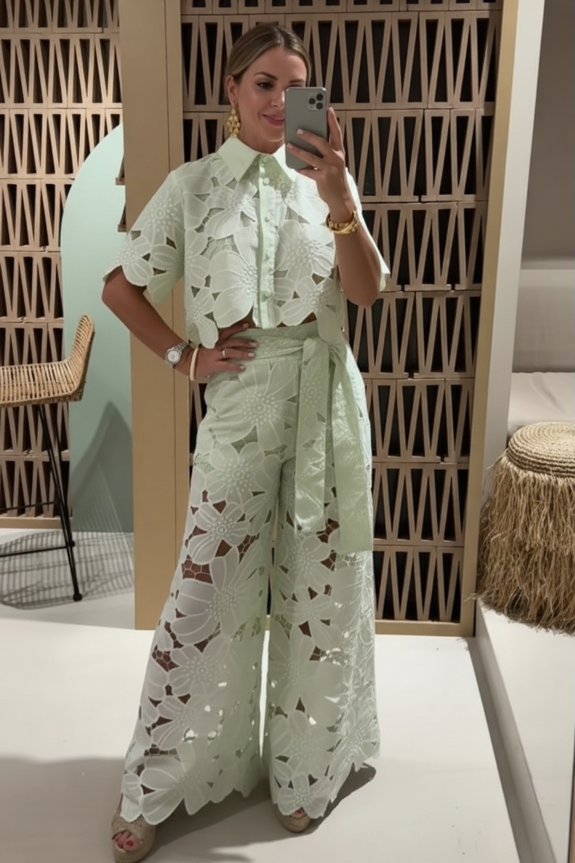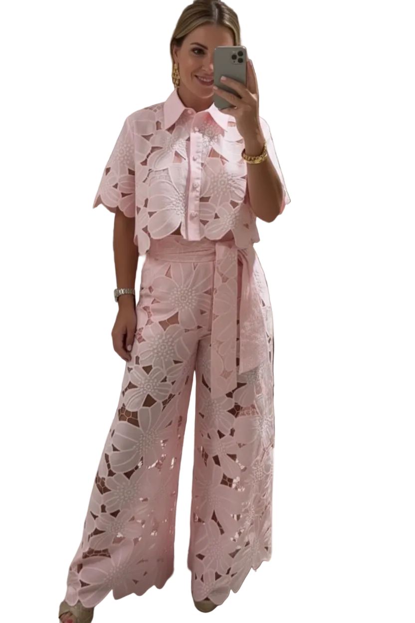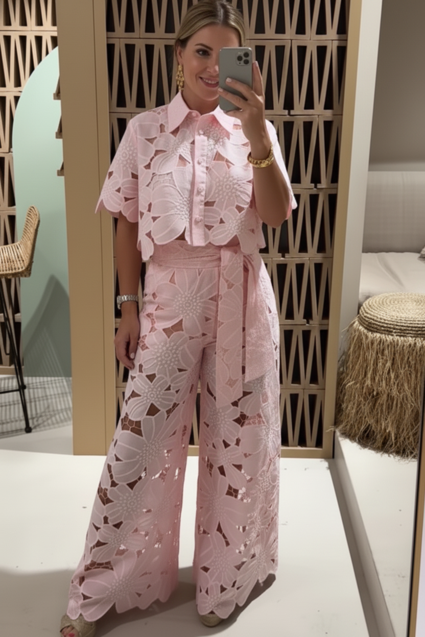 This set includes a short-sleeve, cropped shirt with a button-front closure and a collar. The shirt displays embroidered cutwork across the surface. The trousers have a high-rise waistband and a wide-leg opening that extends to full length. A self-tie belt is included at the waist of the trousers.
