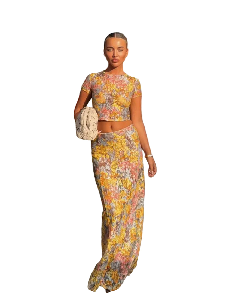 This women's two-piece set includes a short sleeve crop top paired with a maxi-length skirt. Both pieces feature an all-over floral print. The top has a round neckline and ends above the waist. The skirt extends to full length with a straight hemline.