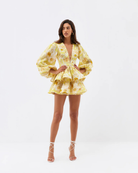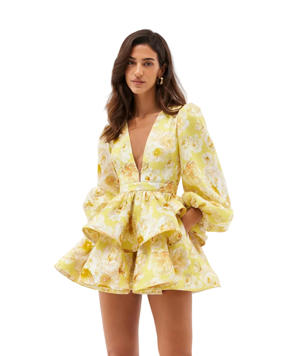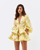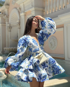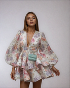 Women's Floral V-Neckline Tiered Mini Dress with Puff Sleeves