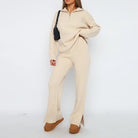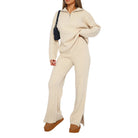 This women's two-piece set consists of a half-zip sweater and matching long trousers. The sweater has a collar with a half-zip closure and long sleeves. The trousers have an elasticated waistband and straight wide legs. Both pieces have a visible ribbed knit surface.