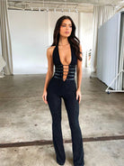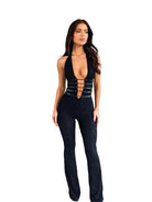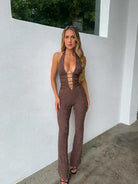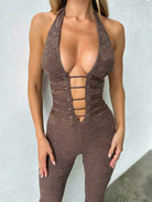 Women's Halter Neck Jumpsuit with Deep V-Neckline Lace-Up Front and Flared Legs