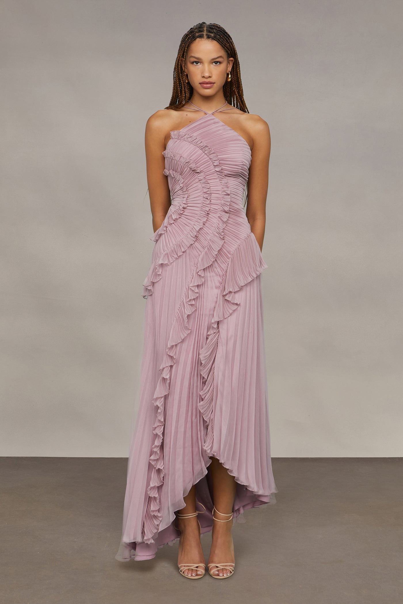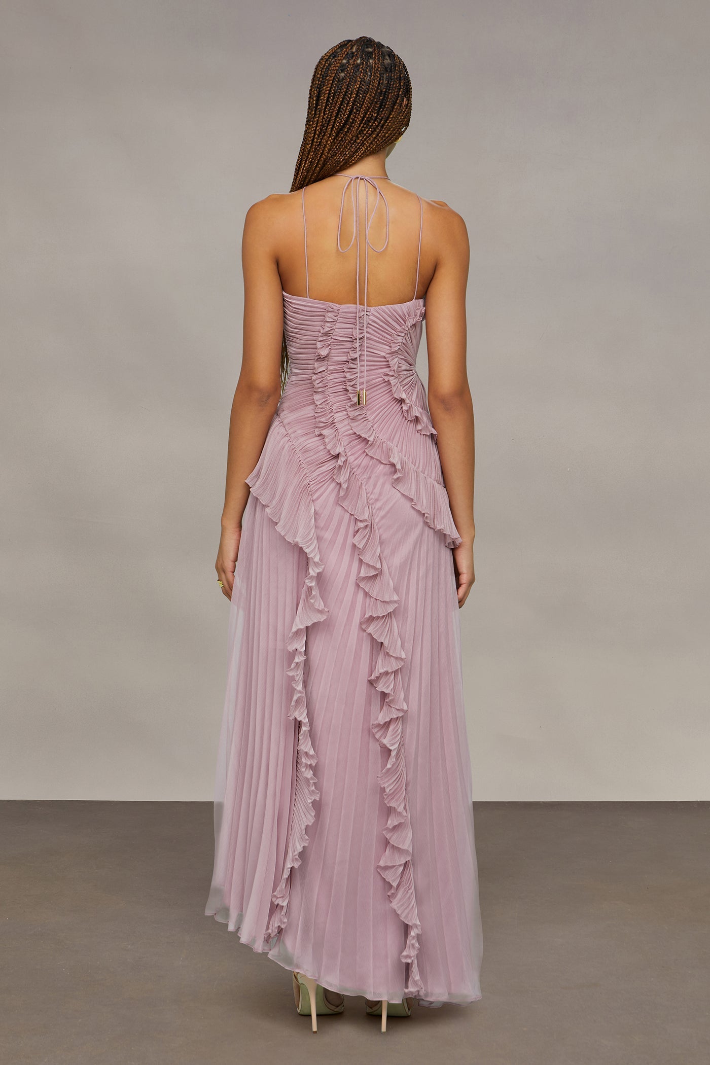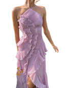 Women's Halter Neck Maxi Dress with Cascading Pleated Ruffles