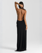 This maxi dress for women features a halter neckline that ties at the back of the neck. The neckline forms a deep V-shape extending from shoulders to waist. The back is fully open from neck to lower back. The skirt includes a high side slit extending from upper thigh to hemline, and the front displays visible fabric folds at the waist with crossover panels.
