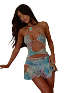 This women's mini dress features a halter neckline with shell bead trim along the front straps. The bodice includes a keyhole at the centre front above the waist. The skirt sits above the knee with a ruffle trim at the hem. A watercolour print pattern covers the entire dress.