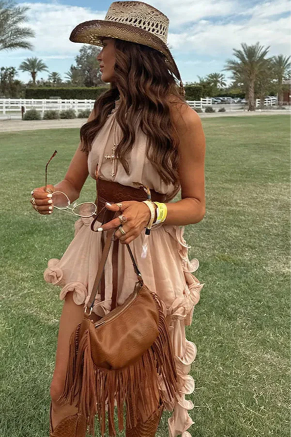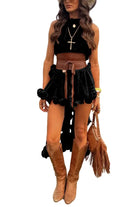 Women's High Neck Sleeveless Top and Ruffle Mini Skirt Set with Back Train