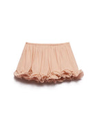 This women's two-piece set includes a sleeveless high-neck top and a mini skirt. The top features a tie closure at the neck and an extended back section with cascading ruffle panels. Both pieces display rosette ruffle sections along the hemlines. The skirt sits at mini length above the knee.
