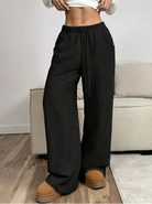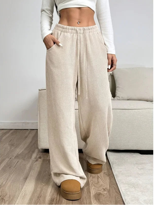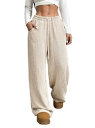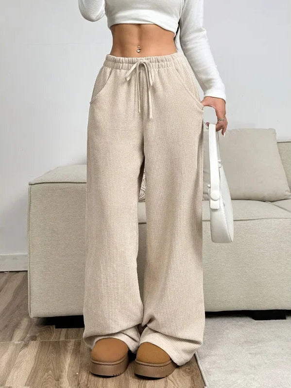 Women's High Waist Drawstring Wide-Leg Trousers with Ribbed Surface