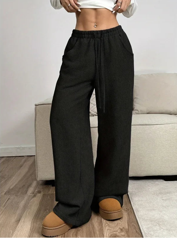 These women's trousers feature a high elasticated waistband with a drawstring closure. The drawstring ends in long ties with tassels. The trousers have wide legs that extend to the ankles with a straight hem. A ribbed surface is visible throughout and side pockets are positioned on each side.