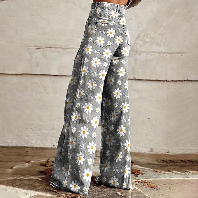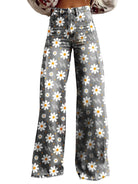 These women's pants feature a high waistband with a button and zip closure at the front. A floral pattern with daisy motifs covers the entire surface. The pants have wide legs that extend to full length. Belt loops are positioned along the waistband.
