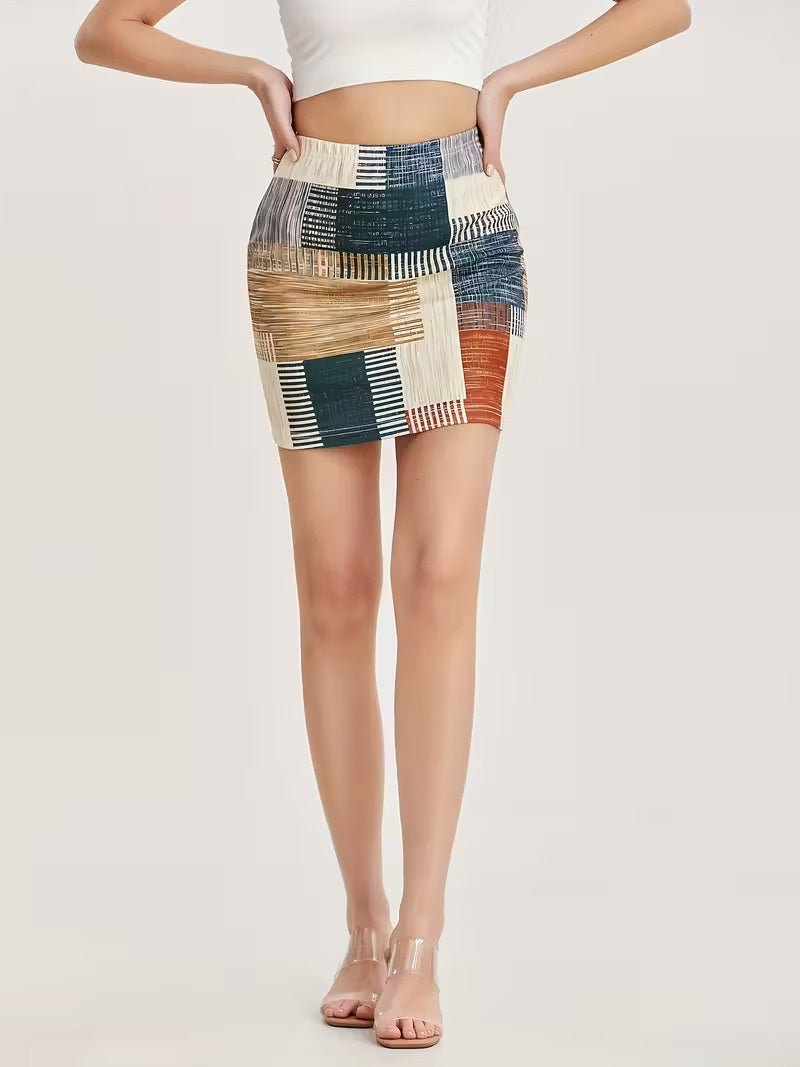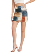 This skirt features a high-waisted cut. It has an all-over pattern made up of various square and rectangular shapes. The hemline falls high above the knee, creating a short length.