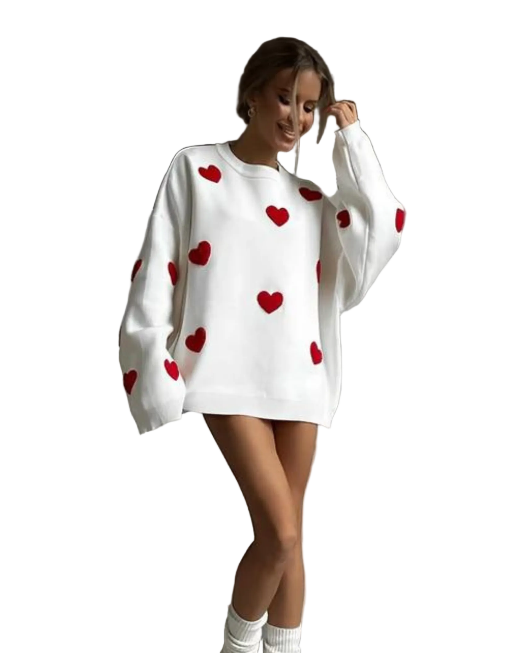 This women's jumper features a ribbed round neckline on a cream base. Multiple heart-shaped appliqués with raised finish are placed across the front and sleeves. Long sleeves have a dropped shoulder seam and end with ribbed cuffs. The hem has ribbed finishing and reaches hip length. The dropped shoulder seams are visible at the upper arm area.