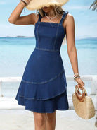 This sleeveless mini dress features a tiered skirt with overlapping, curved tiers. Wide shoulder straps are tied into bows at the top. The neckline is square, and contrast stitching is applied throughout the dress. The back includes a zipper closure running vertically down the center.