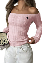 Women's Off-Shoulder Cable Knit Jumper with Ribbed Cuffs and Embroidered Emblem