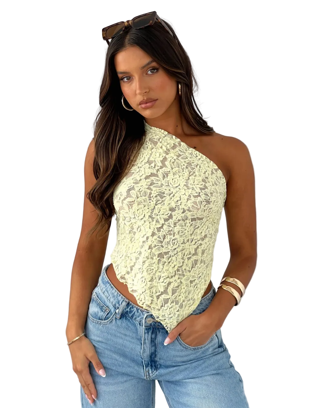 This women's top has a one-shoulder neckline with a halter neck tie extending from the opposite side. The body displays a lace surface with a floral pattern throughout. The hemline is asymmetrical, angling to a point at the front centre. The sleeveless shape leaves both arms and one shoulder exposed.