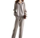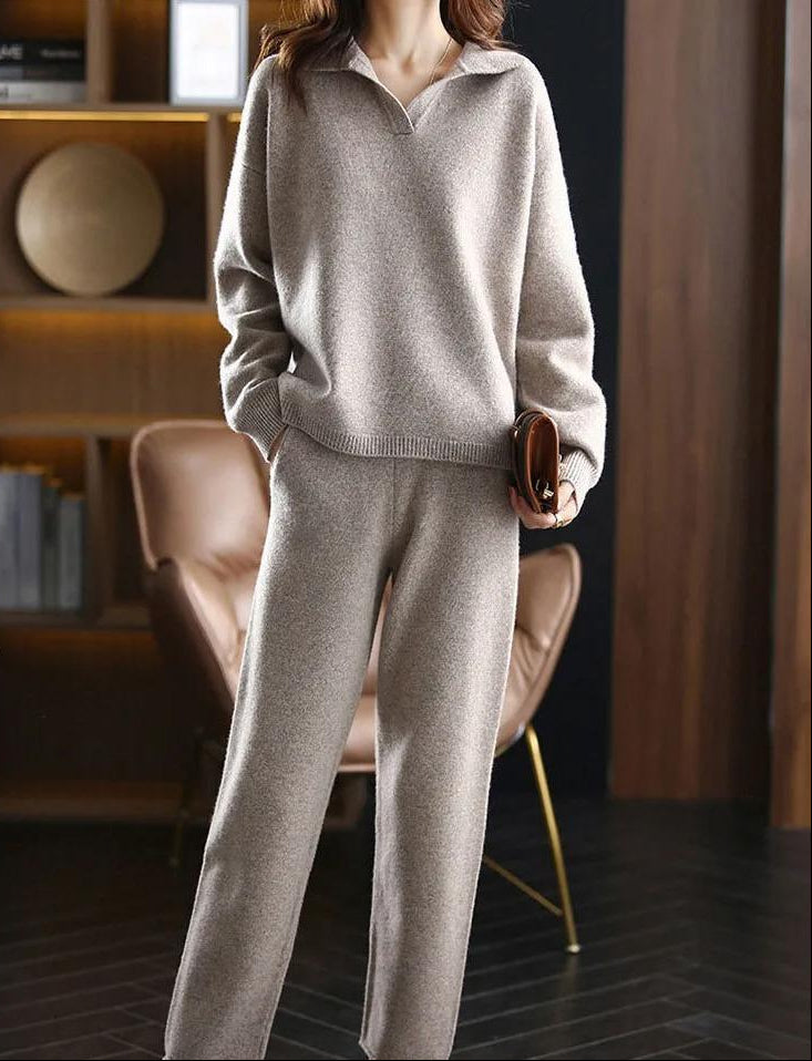 This knit set for women includes a polo collar top with long sleeves and matching pants with an elastic waistband. The top features ribbed cuffs at the wrists and a ribbed hem at the waist. The pants extend to ankle length with straight leg openings. Both pieces display a knit surface throughout.