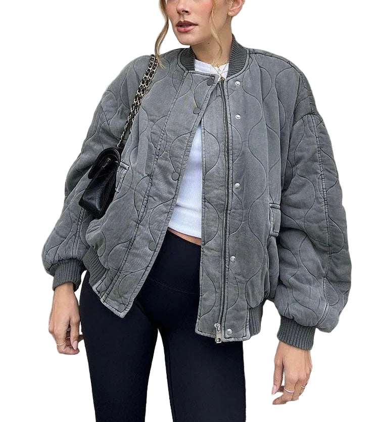 Women's Quilted Bomber Jacket with Curved Stitch Pattern and Ribbed Trim