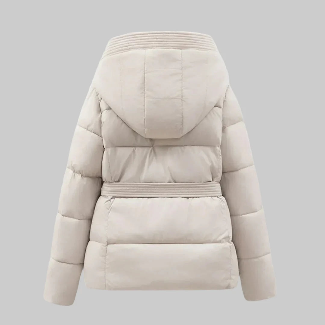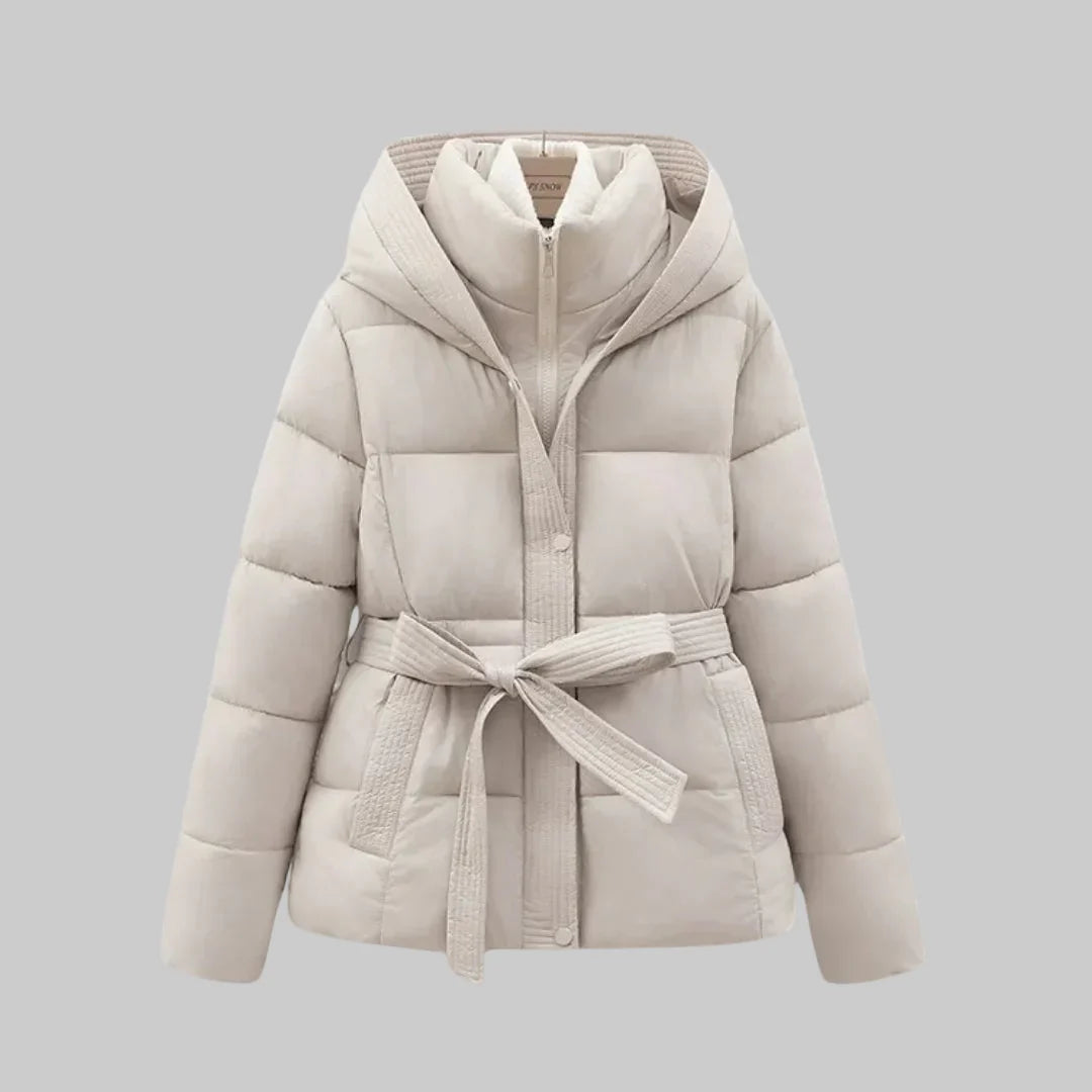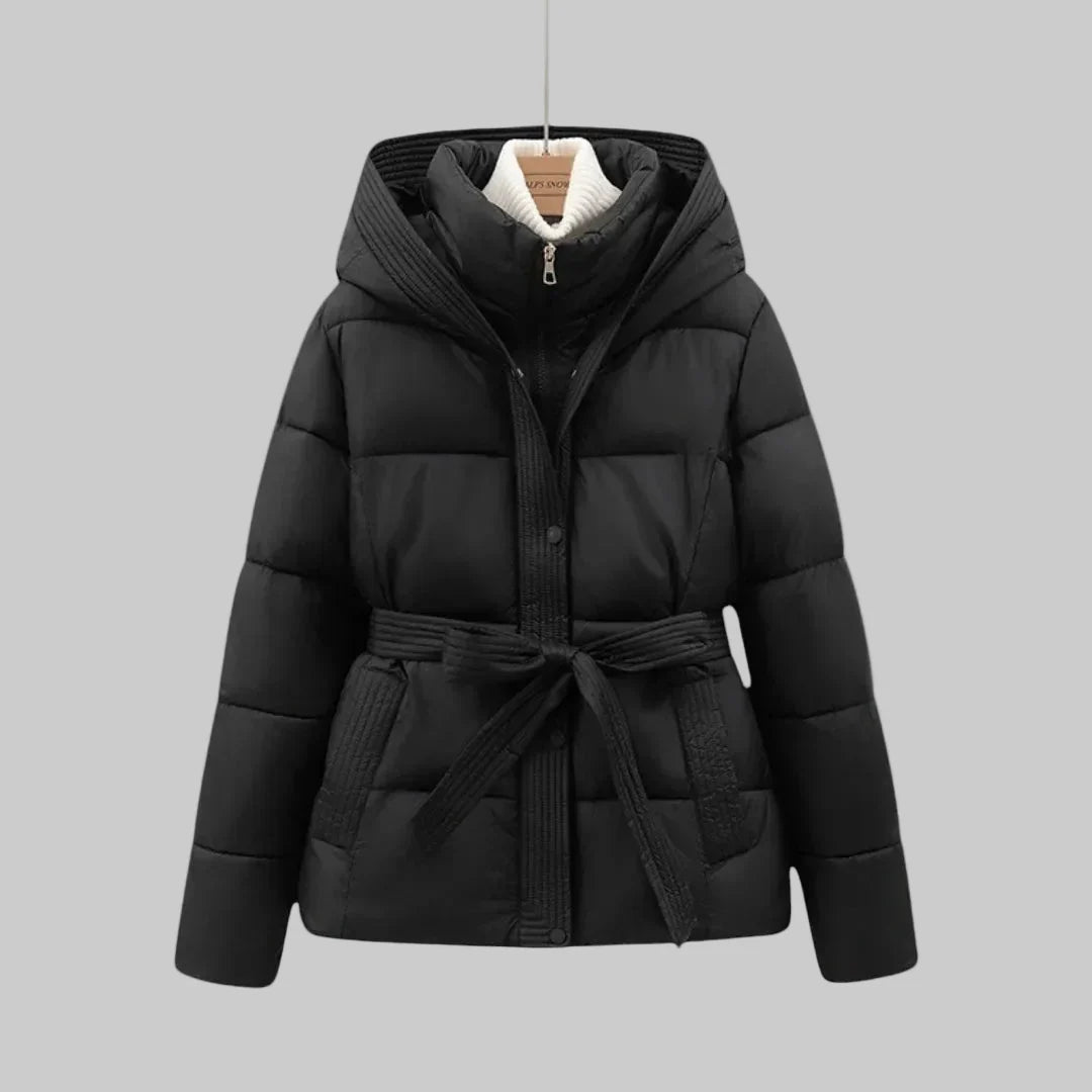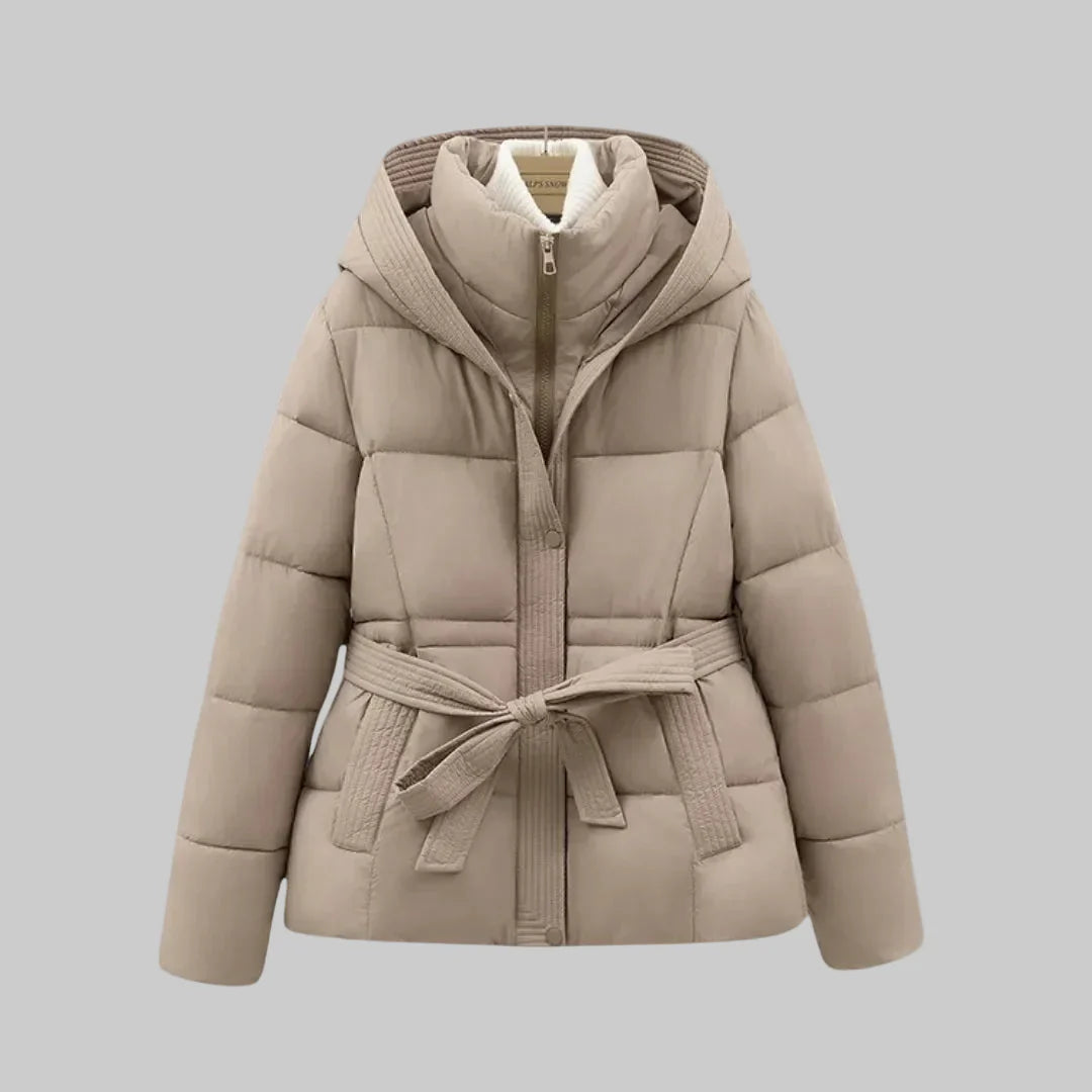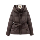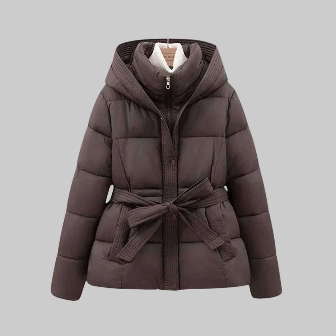 Women's Quilted Puffer Jacket with High Collar and Belt Tie at Waist