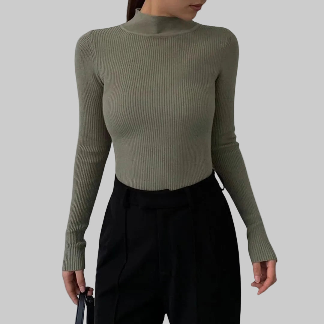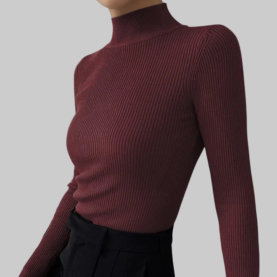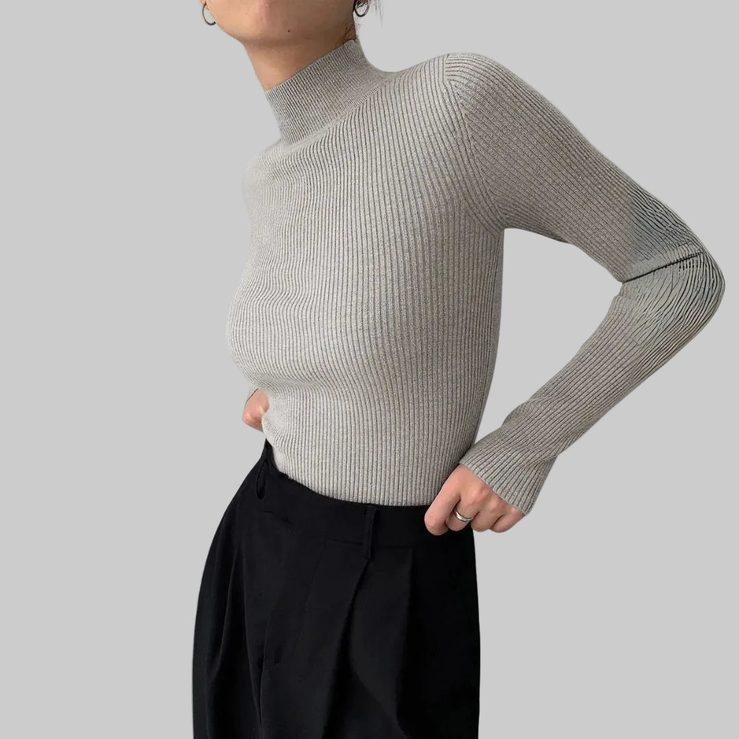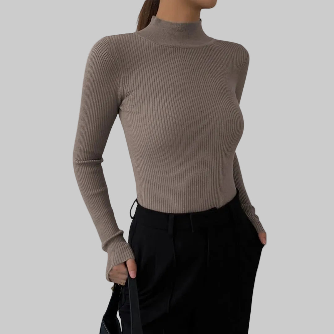 Women's Ribbed Knit Jumper with Mock Neckline and Long Sleeves