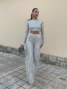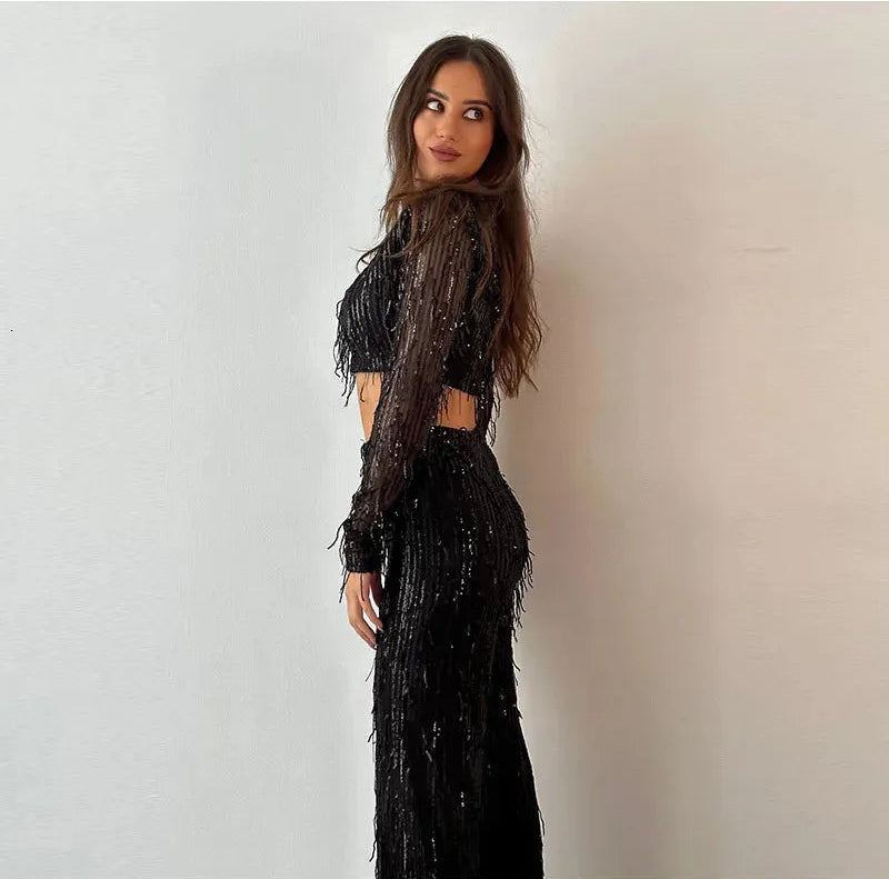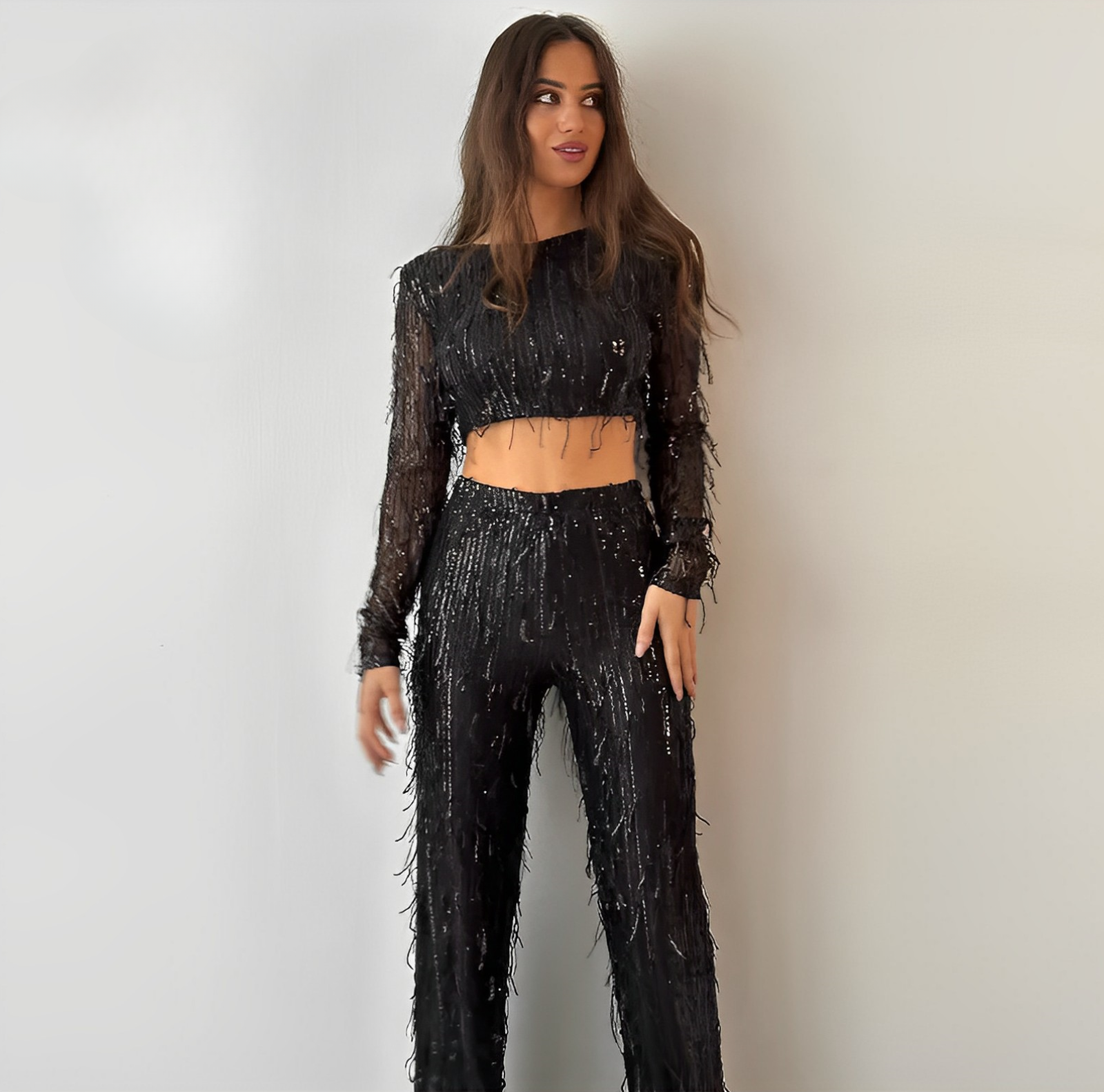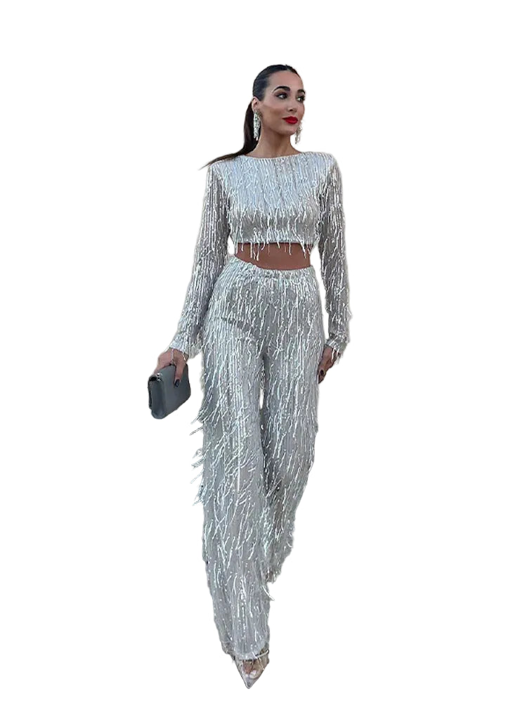 This set includes a long-sleeve crop top and trousers. The top displays a round neckline and a cropped hemline that ends above the waist. Both pieces show a sequin-embellished surface with vertical fringe accents. The trousers extend to full length with straight legs and a high-rise waistband.