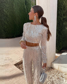 Women's Sequin Embellished Long-Sleeve Crop Top and Trousers Set