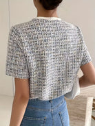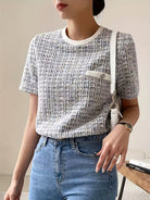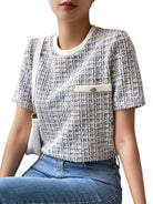 This shirt features short sleeves and a round neckline. The neckline contrasts with the body of the shirt. The shirt has a textured pattern applied throughout the surface. There is a decorative pocket on one side of the chest, accented with contrasting trim and a round button.