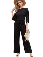 This women's jumpsuit features a round neckline and three-quarter length sleeves. The one-piece garment includes a tie belt at the waist with a side bow closure. Straight-leg pants extend to ankle length with a straight hemline. The bodice gathers at the waistline.