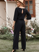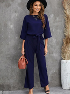 Women's Three-Quarter Sleeve Jumpsuit with Round Neckline and Tie Belt