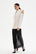 This women's blazer has an extended shoulder accent on each side. The neckline forms a deep V-shape with a wrap front closure. Long sleeves extend to the wrist with straight cuffs. The hemline sits at hip length.