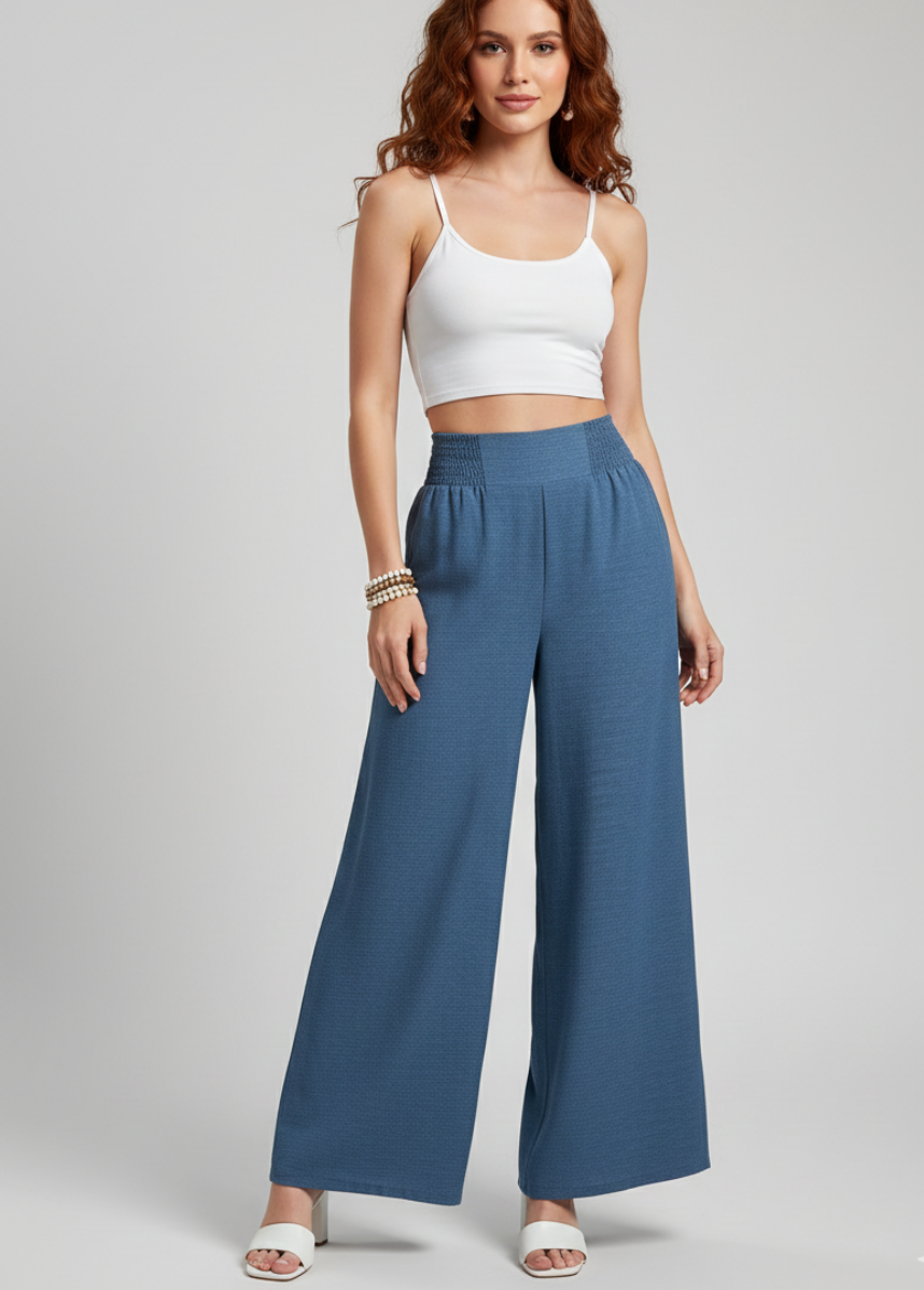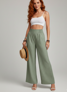 This women's pants feature a high-rise waistband with visible elastic gathering at the sides. The legs extend in a wide-leg from hip to ankle. The garment reaches full length ending at the ankle area. The waistband sits above the natural waist level with no visible button or zip closure at the front.