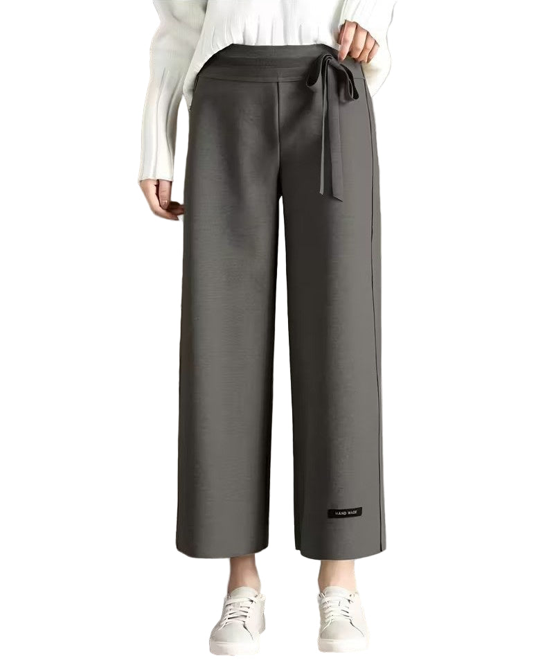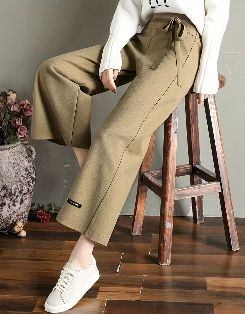 - Style: Ankle length wide-leg pants with tie belt at the waist.